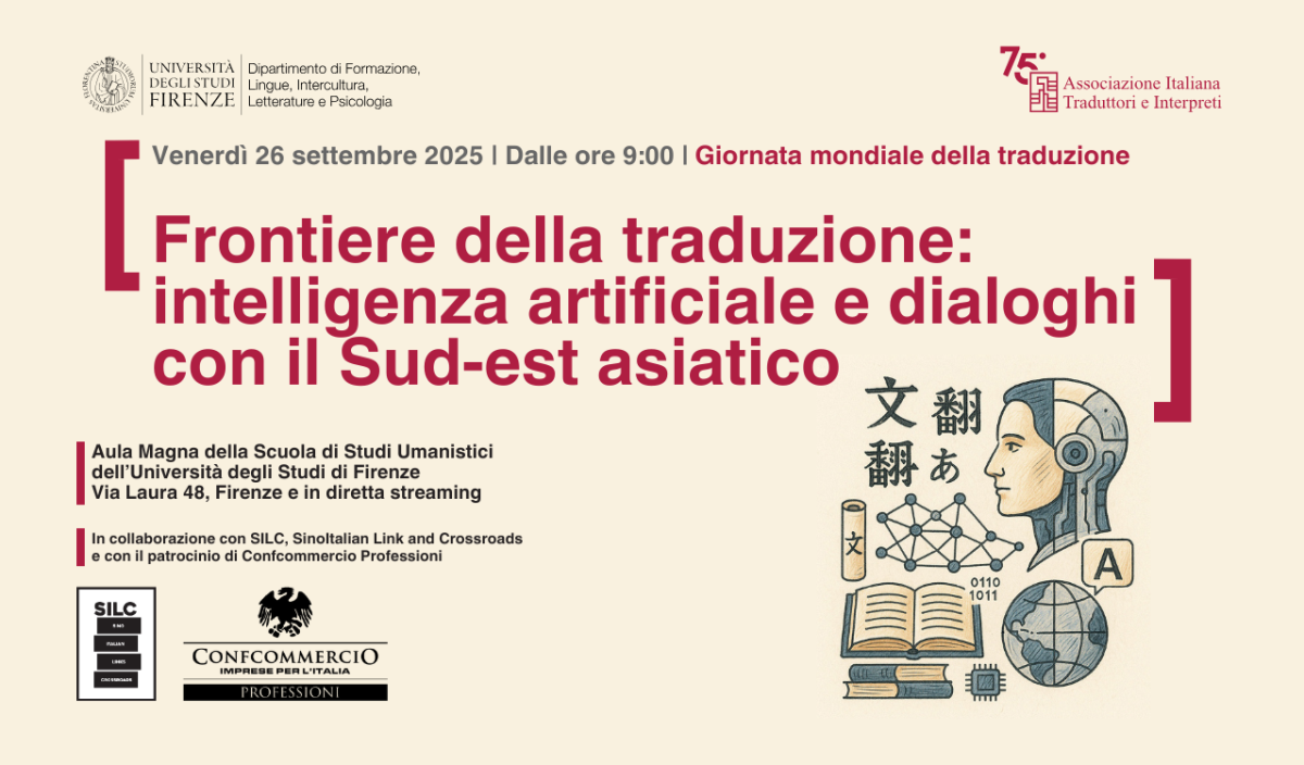 Venerdì 26 settembre l’Associazione Italiana Traduttori e Interpreti (AITI), l’Università degli Studi di Firenze e SILC – SinoItalian Link and Crossroads organizzano, con il patrocinio di Confcommercio Professioni, il terzo evento nazionale per celebrare la Giornata mondiale della traduzione e i 75 anni di AITI: “Frontiere della Traduzione: Intelligenza Artificiale e dialoghi con il Sud-est asiatico”.